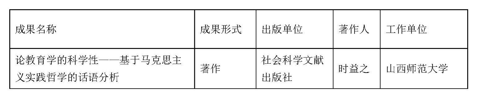 教师时益之副教授的著作《论教育学的科学性——基于马克思主义实践哲学的话语分析》获2024年度山西省社会科学研究优秀成果“百部(篇)工程”一等奖。