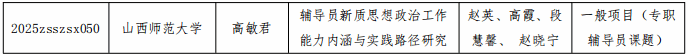 近日,省教育厅公布了2025年度山西省高等学校哲学社会科学研究项目(思想政治教育专项)立项结果, 成人论坛 专职辅导员高敏君申报的《辅导员新质思想政治工作能力内涵与实践路径研究》成功入选。该项目聚焦新时代背景下辅导员思想政治教育工作的创新发展需求,探索提升辅导员专业化、职业化水平的实践路径。